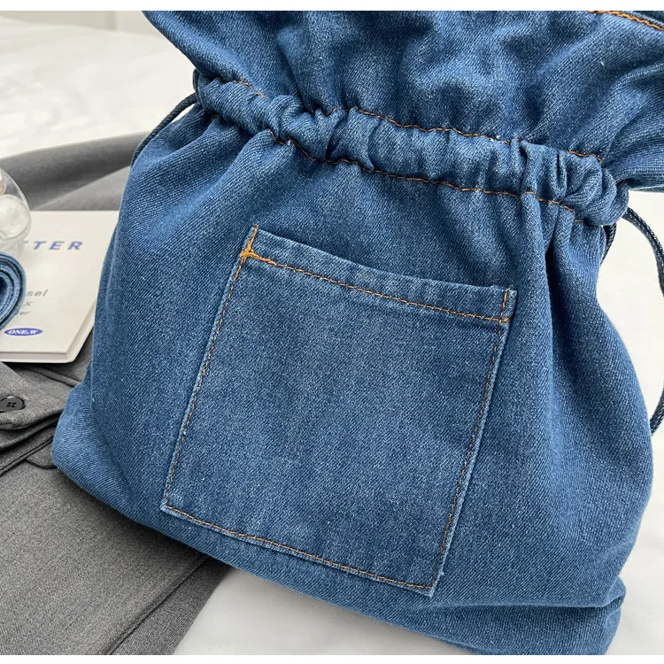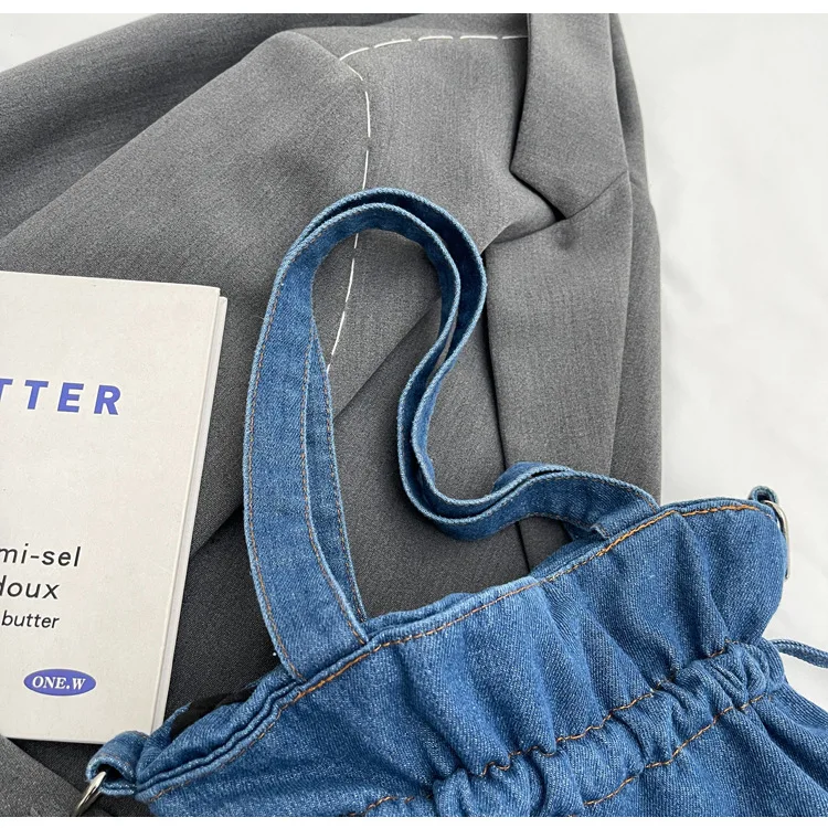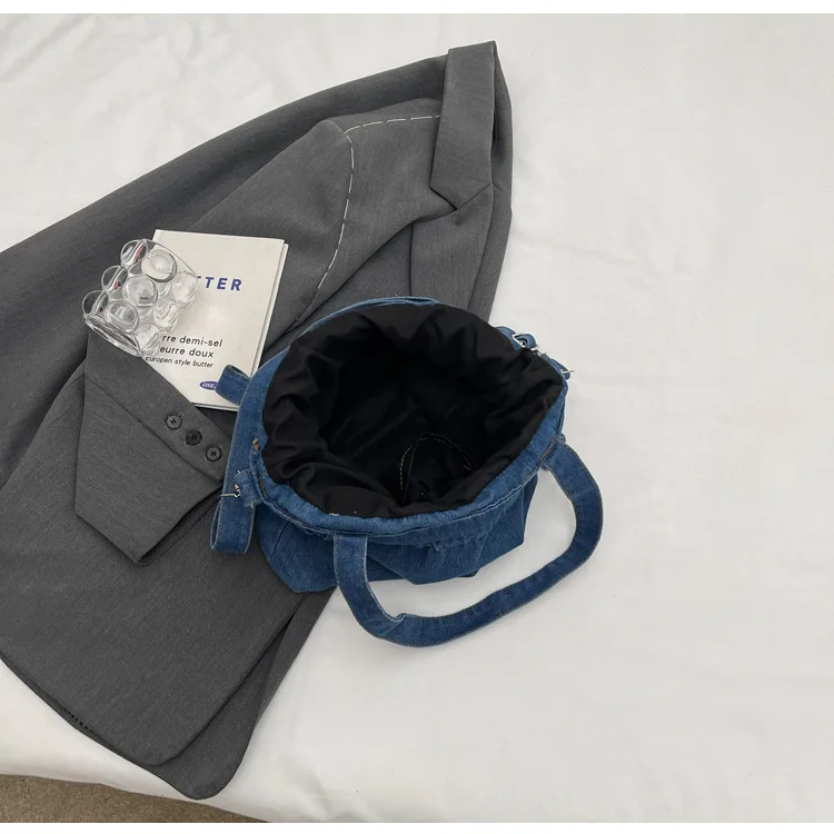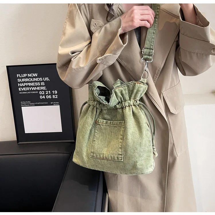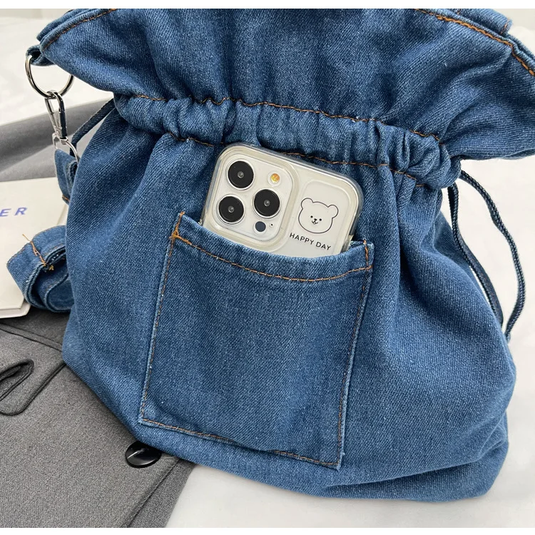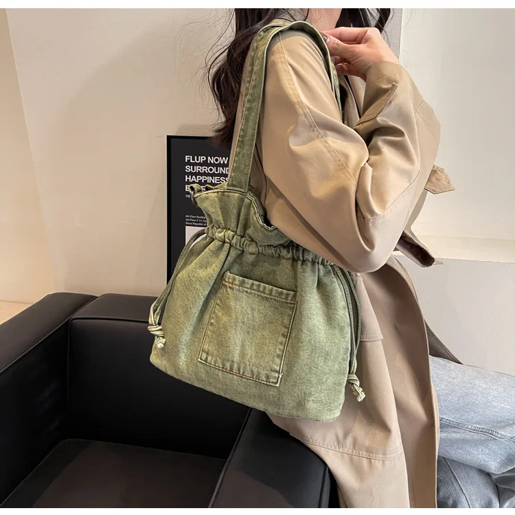 Xajzpa Denim Canvas Shoulder Bag Large Capacity Fashionable Drawstring Design Crossbody Tote Bag Student Textbook Shoulder Handbag