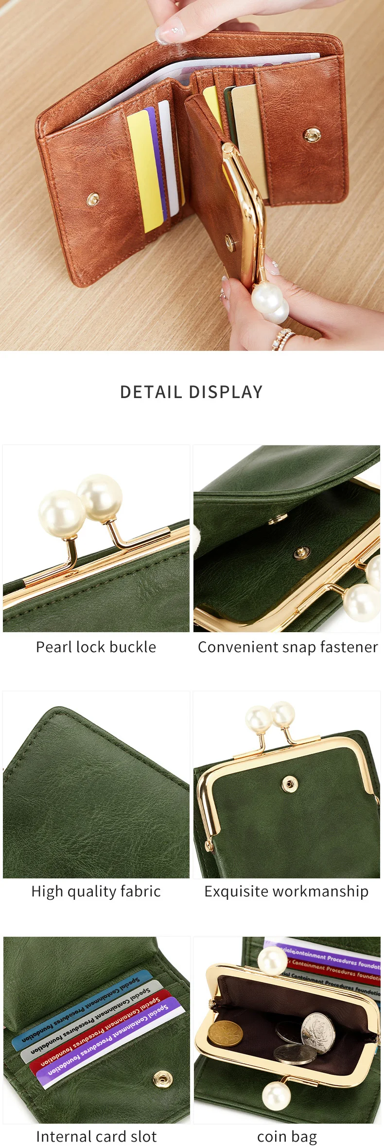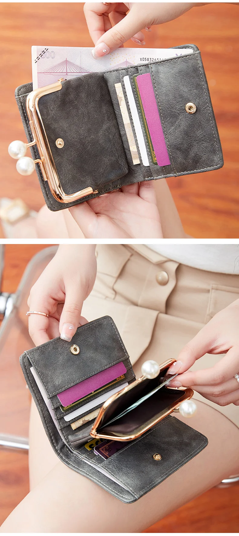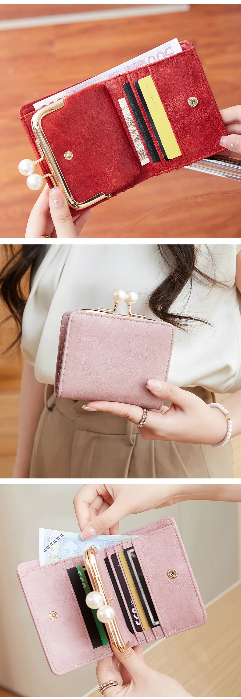 Xajzpa Women's Wallet Short Compact Three Layer Large Capacity Retro Pearl Wallet High Quality PU Leather Multi Card Seat/Coin Zero Wallet