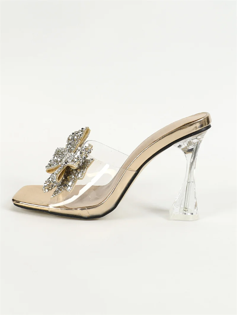 Xajzpa Fashion Silver Sequined Butterfly Knot Women Transparent Slippers Summer Square Toe Clear High Heels Sandals Female Shoes