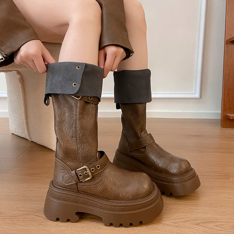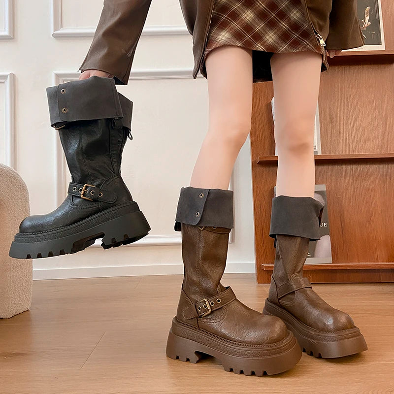 Xajzpa New Women's Shoes Basic Classics Knee-High Boot Women Belt Buckle Side Zip Round Toe Wedge Platform Shoes Ladies Zapatos Mujer