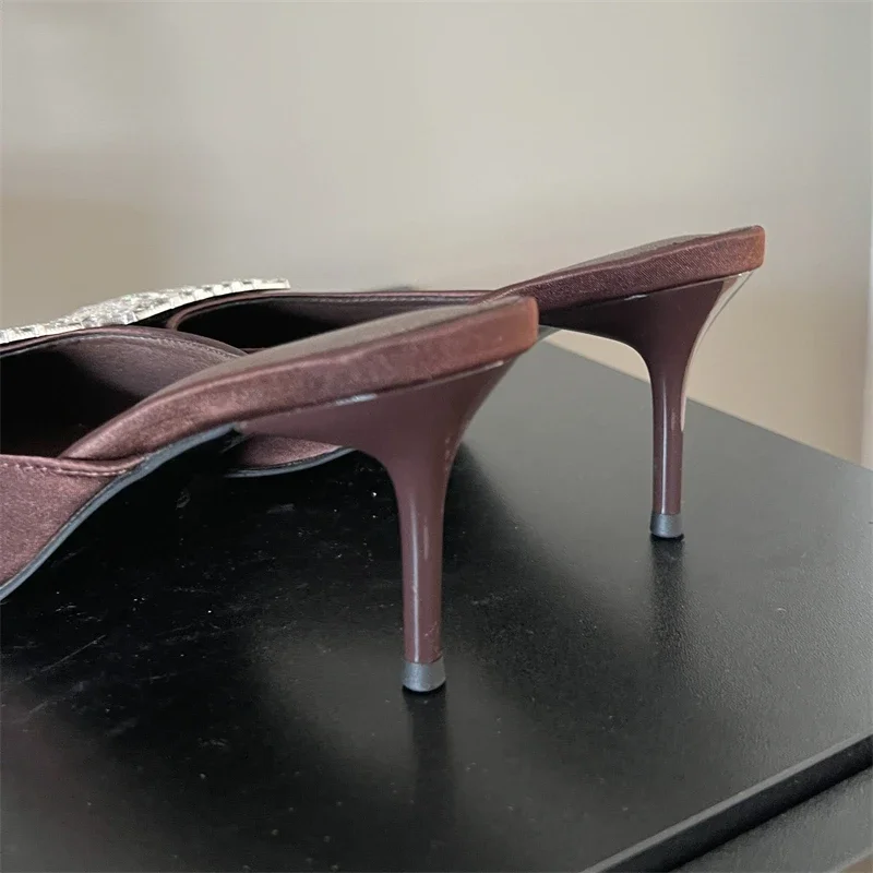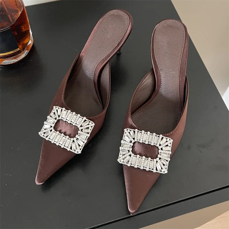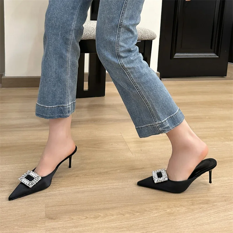 Xajzpa Spring Pointed Toe Crystal Buckle Mules Slippers Women Fashion Thin Heels Casual Party Shoes Zapatos De Mujer