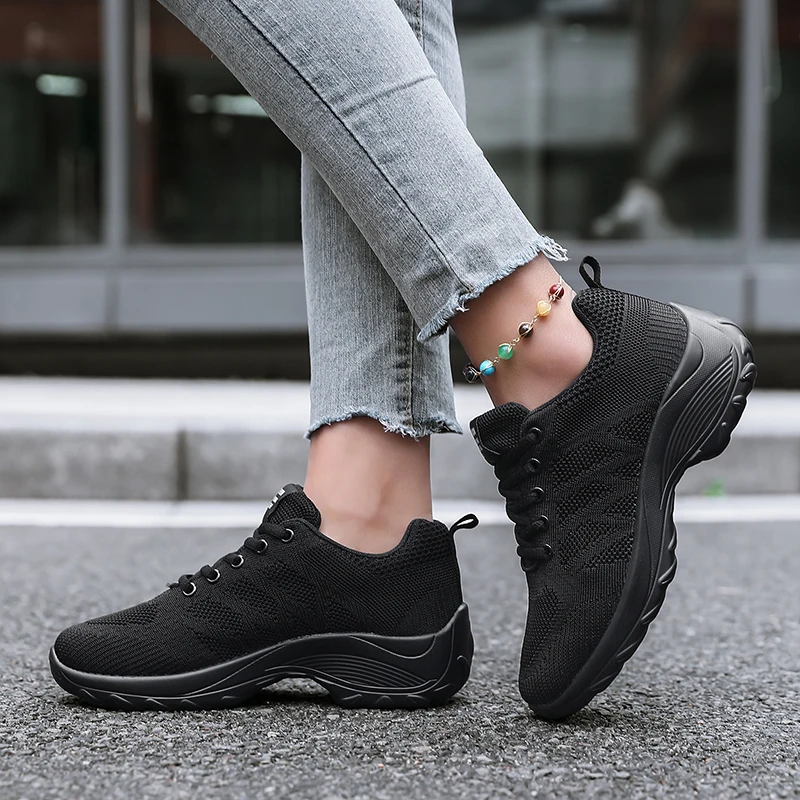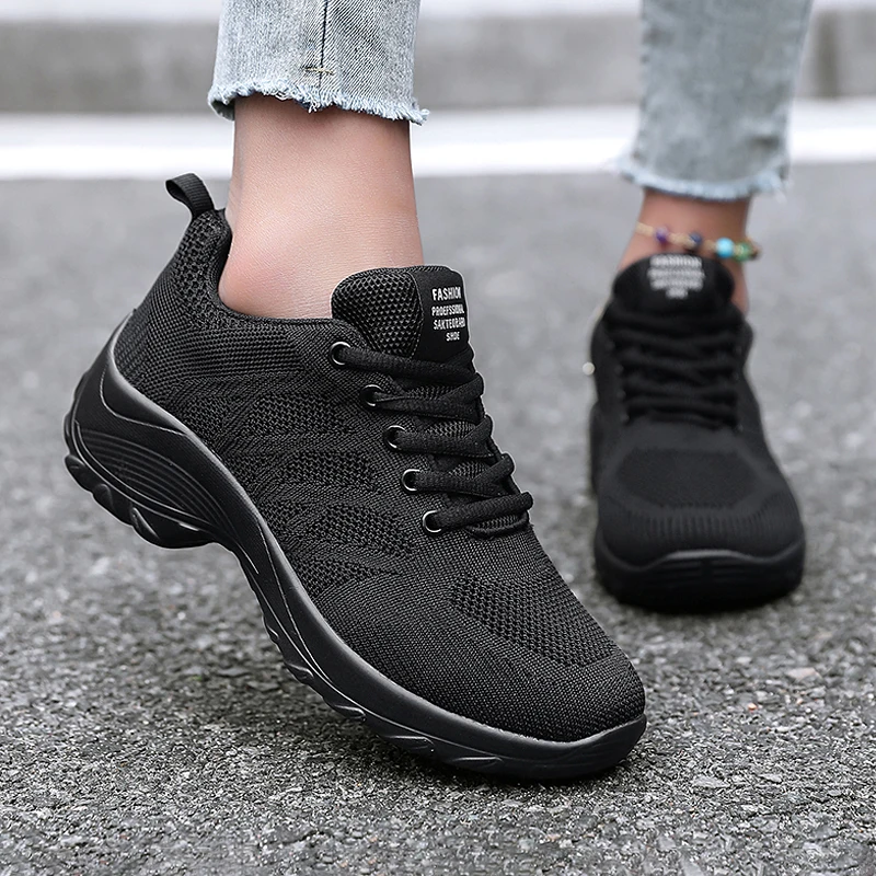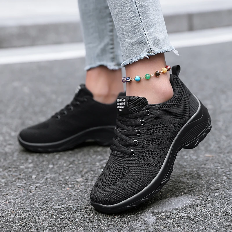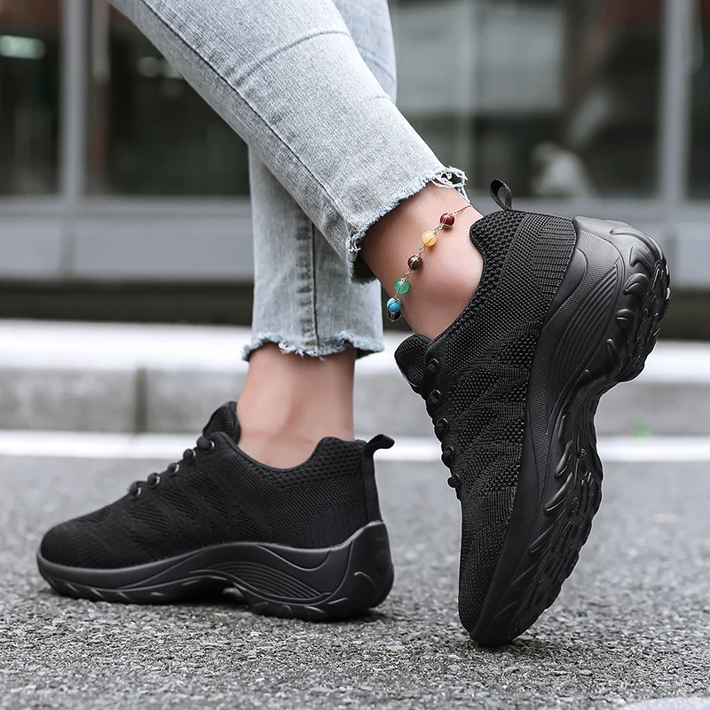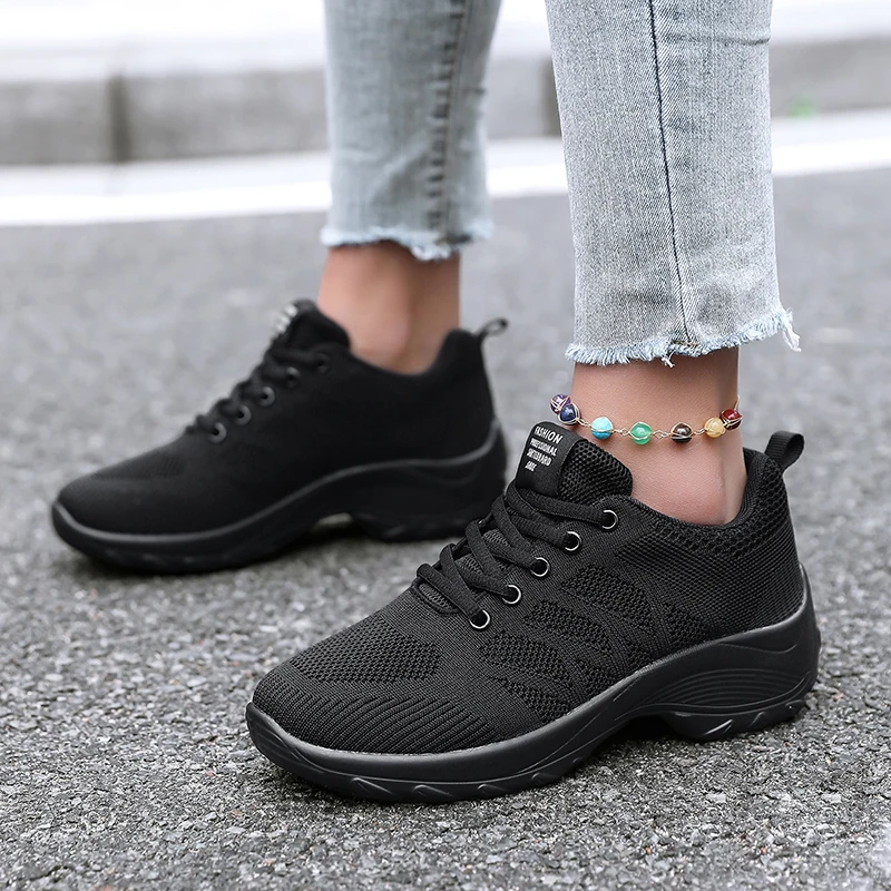 Xajzpa Women's Casual Shoes Breathable Walking Mesh Fabric Lace Up Flat Sports Shoes Women's Tenis Feminino Black Hiking Running Shoes